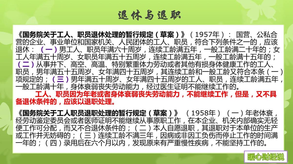 1957年和1958年,国务院分别颁布了《关于工人、职员退休处理的暂行规定》和《关于工人、职员退职处理的暂行规定》,国家统一了工人、机关事业单位的退休退职条件,也统一了养老待遇的各种计算标准和方式。关于退职情况比较复杂,1958年开始国家还出现了一批精简退职职工。