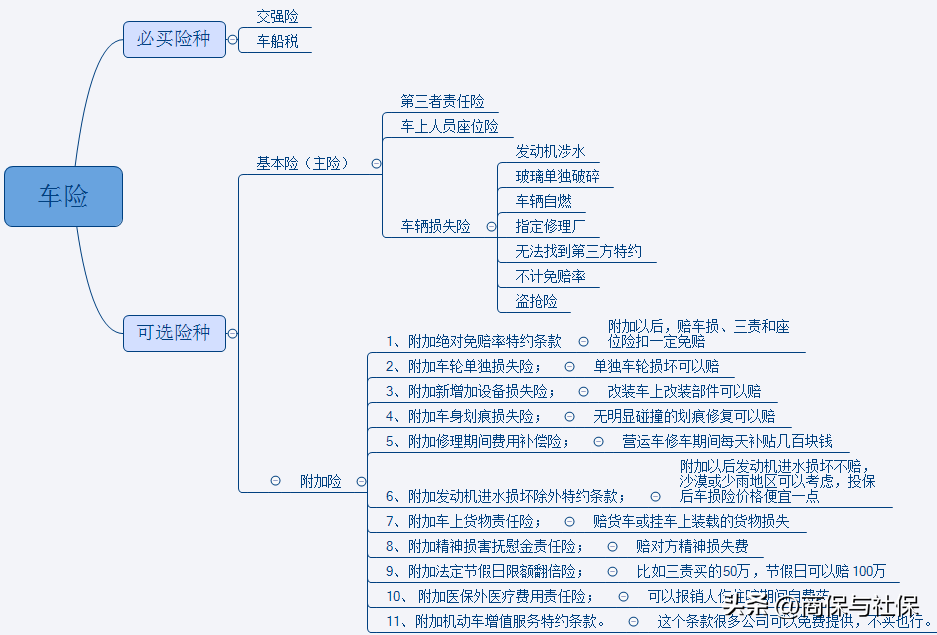 车险改革以后,商业险包括三大主险及其对应的11个附加险。看看下图中不同险种的作用: