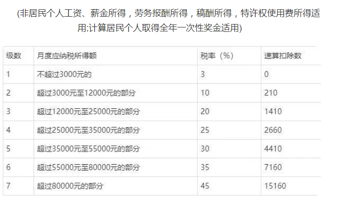 综合所得月度税率和速算扣除数表(适用于月度计算):