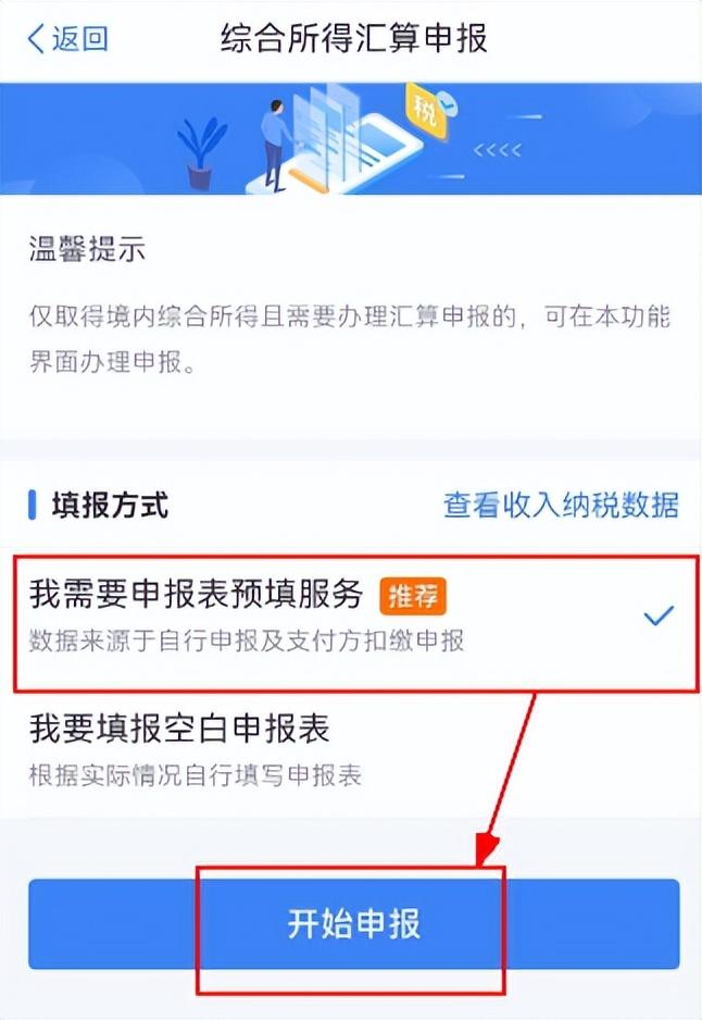 1.查询确认2021年度内确实有确定全年一次性奖金收入后,点击【返回】,回到汇算申报界面,选择填报方式为【我需要申报表预填服务】,点击【开始申报】。