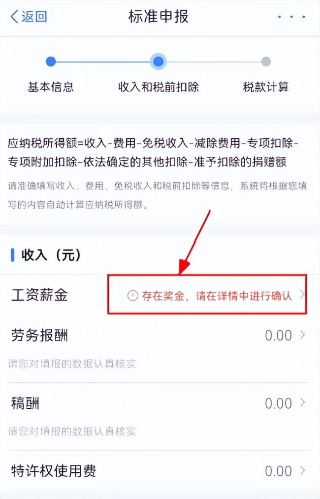 2.在汇算申报的【收入和税前扣除】界面,对于存在全年奖预缴申报数据的,可以看到在【工资薪金】一栏有一行红字提示,需要您手动确认奖金计税方式。