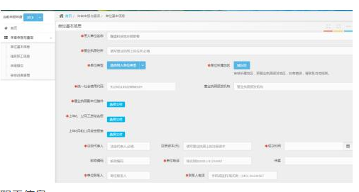 下拉,进行年度切换),在左侧菜单依次点击:“年审申报与查询”→“单位基本信息”,进入如下页面,在此页面填写和上传单位的相关信息,点击下部的