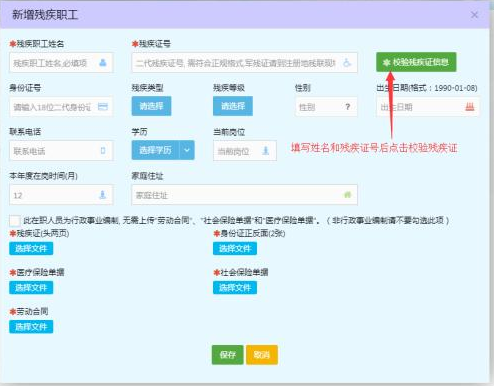 b) 点击的“新增残疾职工”窗口,填写和上传残疾职工相应资料或文件,如下图: