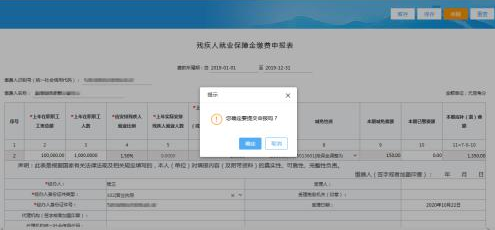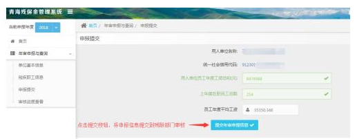 在填写完成“单位基本信息”和“残疾职工信息”(如果有残疾职工的话)后,点击左侧菜单“申报提交”,在本页面两个录入框填写“用人单位员工年度工资总和”和“上年度在职员工总数”,并且确认前两步填写的“单位基本信息”与“残疾职工信息”均无误后再点击