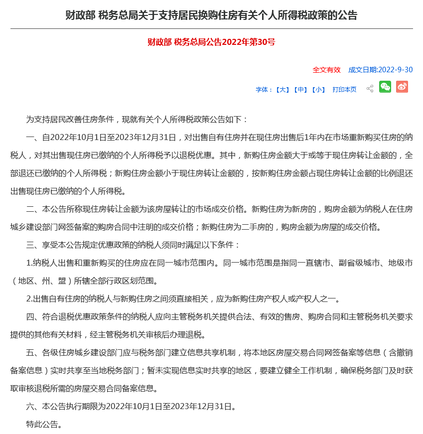 昨天,财政部和国家税务总局联合发文,对卖房再买房实行退税政策。