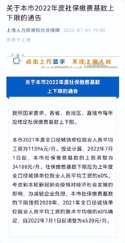 比如上海,2021年度全口径城镇单位就业人员平均工资为11396元/月,2022年7月1日起,社保缴费基数的上限调整为34188元/月。