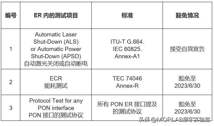 TEC延长豁免PON(无源光网络)类别ER(基本要求)中的ECR测试项目,如下表。