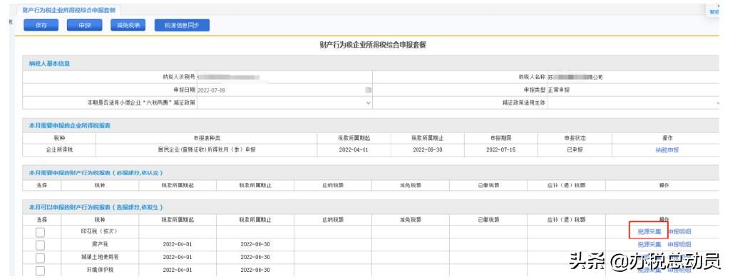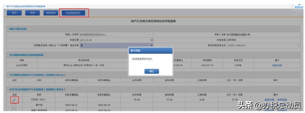 回到 财产行为税企业所得税综合申报套餐 接满,勾选印花税(按次)点击税源信息同步后,进行申报即可。