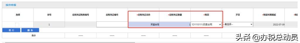 *税目选择101110111|买卖合同,*应税凭证名称自动带出买卖合同,填写*应税凭证数量 1