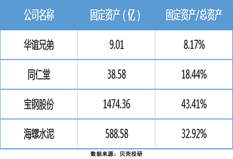 华谊兄弟(主营电影业务)和同仁堂固定资产占总资产比重较低,分别为8.17%、18.44%,属于轻资产企业。宝钢股份(主营钢铁、煤炭)和海螺水泥固定资产占比依次为43.41%和32.92%都在30%以上,说明企业固定资产投入多,属于重资产企业。根据现行企业法规定,企业注册资本中资金比例不得低于30%,即意味着固定资产作为投资,最多占总资产比重的70%。