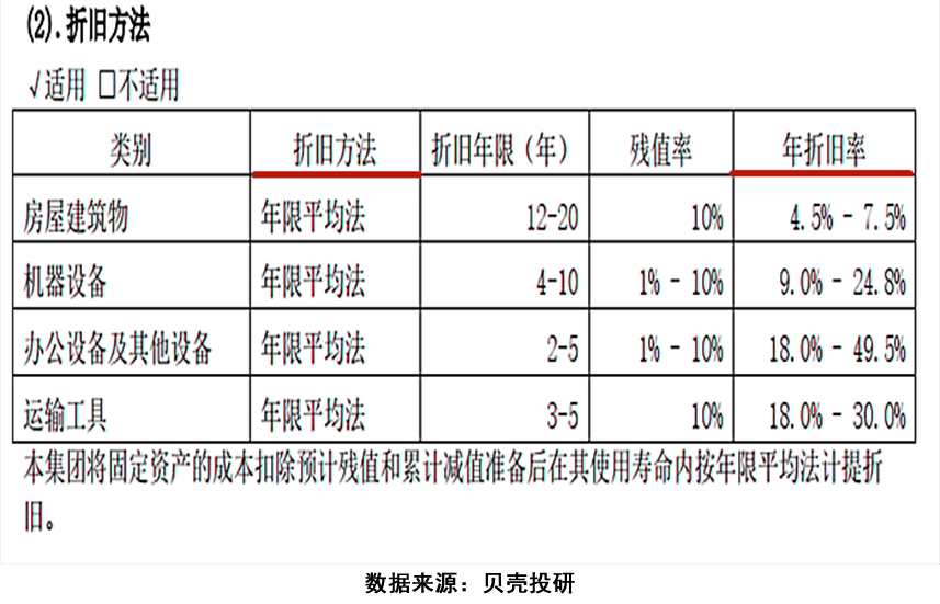 固定资产有使用寿命,所以每年要对其计提折旧,并计入当期损益。折旧方法有直线法、工作量法、双倍余额递减法等等。如下图海天味业2019年固定资产折旧使用的是直线法(年限平均法),不同年限对应不同的折旧率。