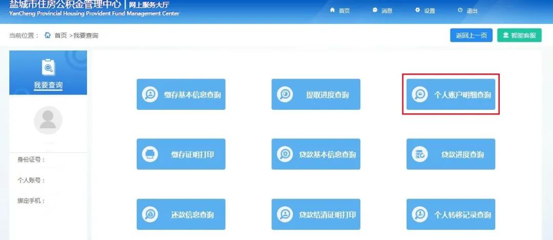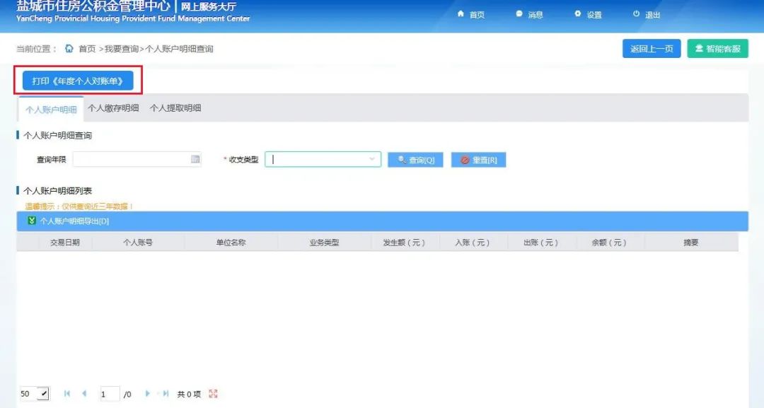 3、登录盐城市住房公积金网站“ycgjj.yancheng.gov.cn”,点击“网上服务大厅-个人用户”,登录个人公积金账户,点击“我要查询-个人账户明细查询-打印《年度个人对账单》”进行查询和下载。