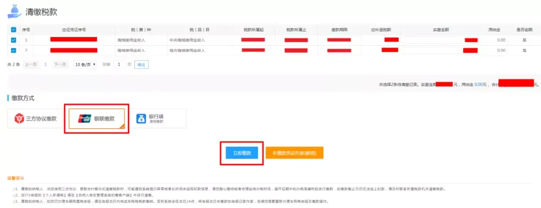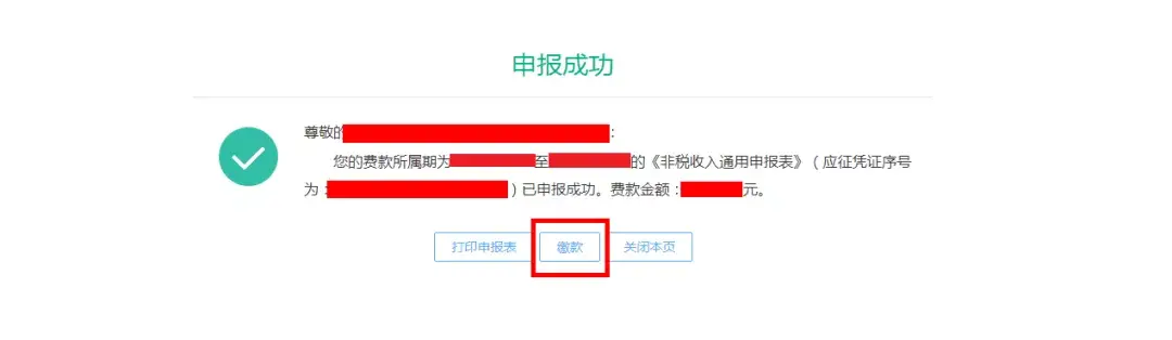 系统提示申报成功后,确认金额无误,【点击缴款】缴纳费款。