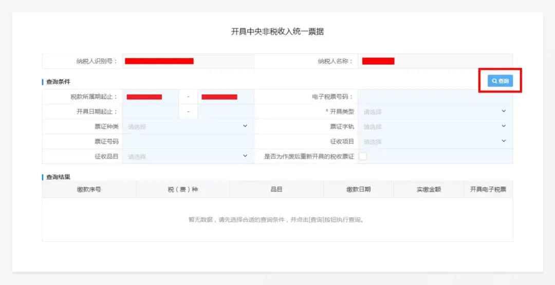 缴款完毕后,在主页点击“我要办税”—“证明开具”—“开具中央非税收入统一票据”,选择正确的查询条件,点击【查询】。