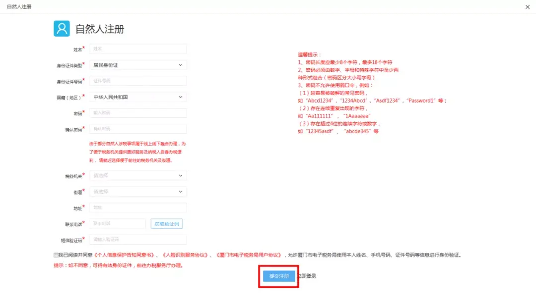 点击【在线注册】,即出现“自然人注册”界面,将信息填写完整,点击【提交注册】即可。