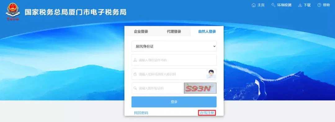 (2)若为自然人,请选择“自然人登录”,输入“证件号码”、“密码”、“图形验证码”,点击【登录】按钮。如果没有通过微信或支付宝小程序“厦门税务掌上办税厅”完成自然人电子税务局注册,可以使用【在线注册】功能生成登录密码再登录或“人脸识别”验证方式登录。