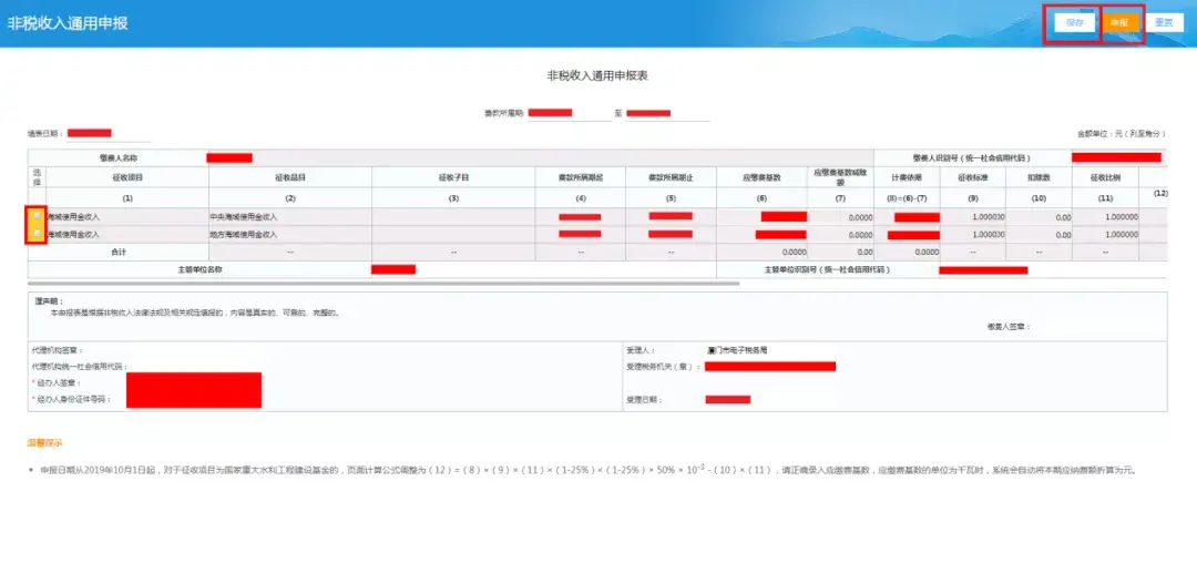 点击【确定】后即可进入申报界面,勾选所需申报记录并录入经办人签章及经办人身份证件号码,点击【保存】—【申报】提交申报表。