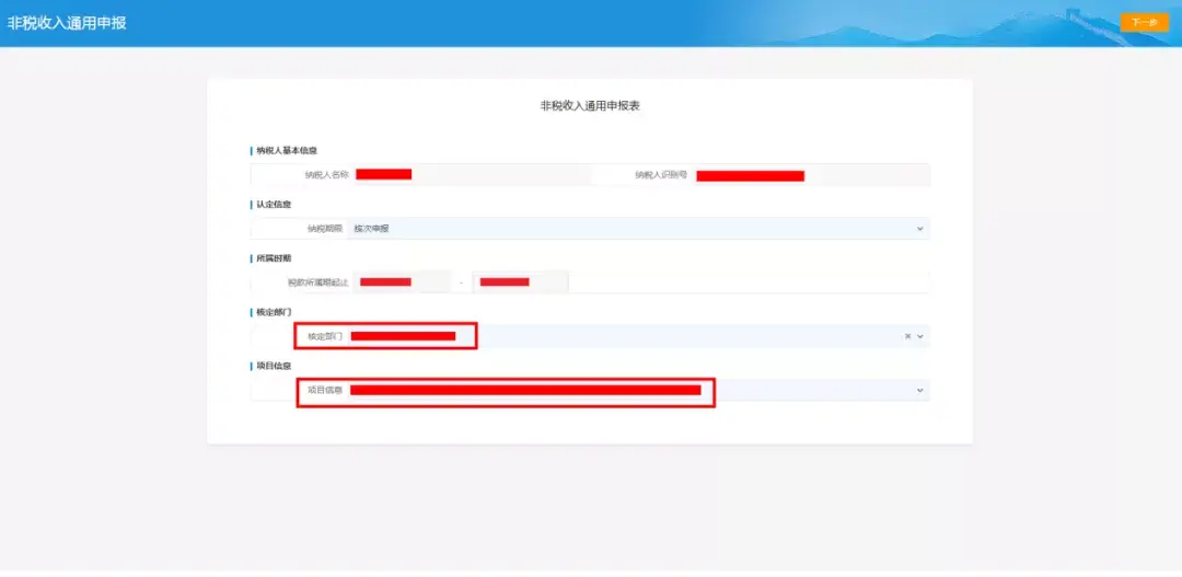 进入非税收入申报后,选择“核定部门”及“项目信息”,点击右上角【下一步】进入申报界面。
