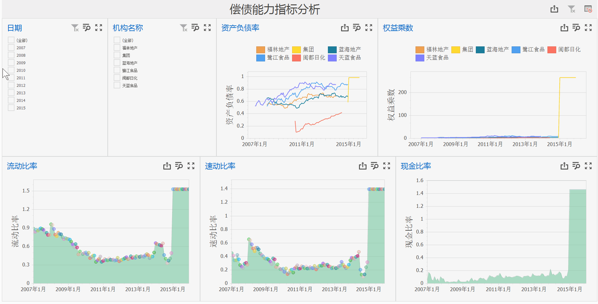 分析者想了解公司的偿债能力情况,并通过历史数据的分析发现公司偿债能力存在的问题,但相关财务数据存在多家公司的多个账套中,获取相关指标数据便要花费大量的时间精力进行整合,如何能够便捷地进行公司偿债能力分析?