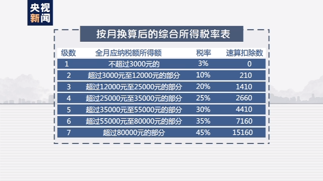 其中,速算扣除数和税率对应全月应纳税所得额,分为7个档次。全月应纳税所得额不超过3000元的,税率为3%,速算扣除数为0;超过3000元至12000元的部分,税率为10%,速算扣除数为210;而最高的一档,也就是全月应纳税所得额超过80000元的部分,税率为45%,速算扣除数为15160。