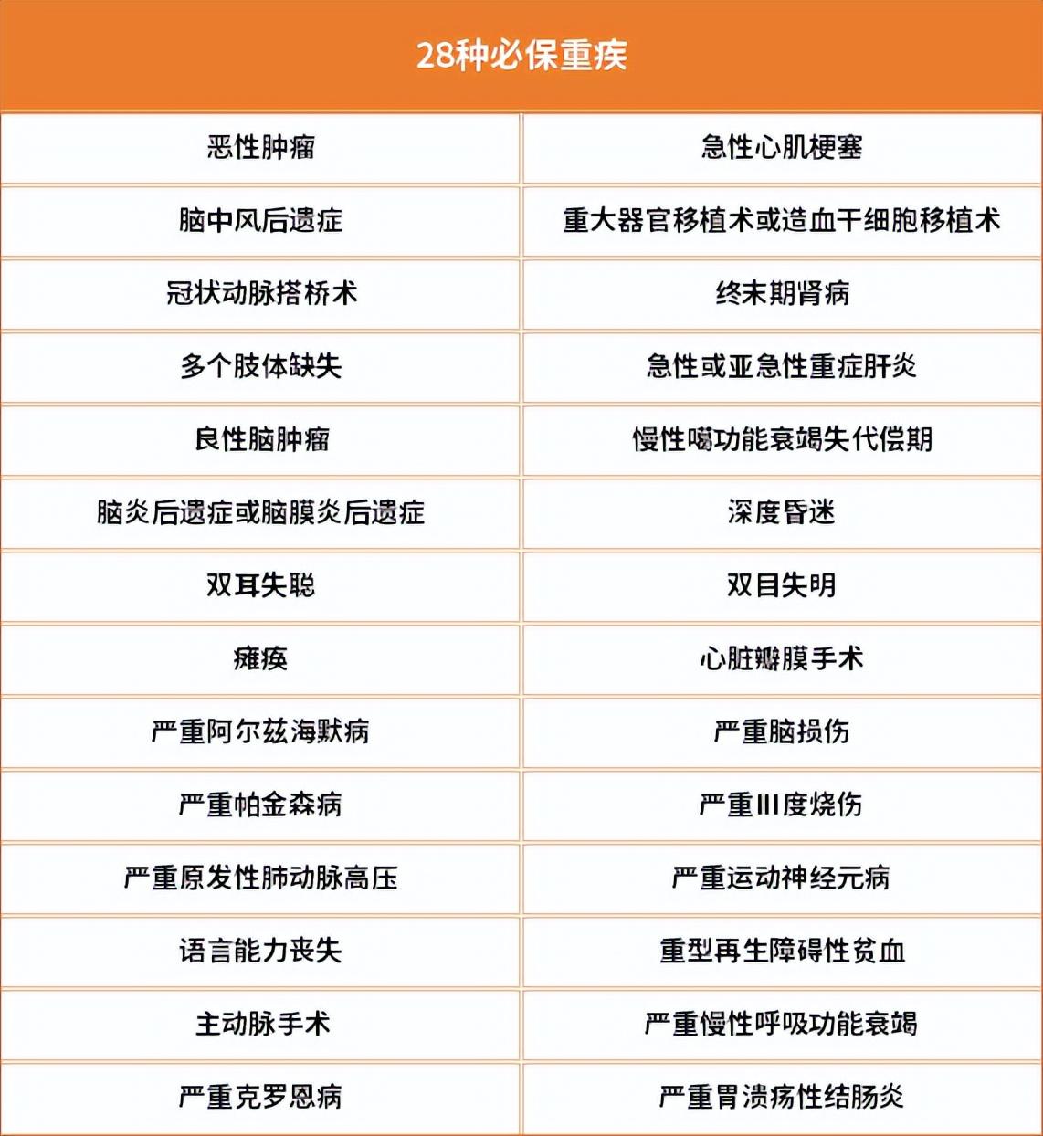 28种必保重疾如下: