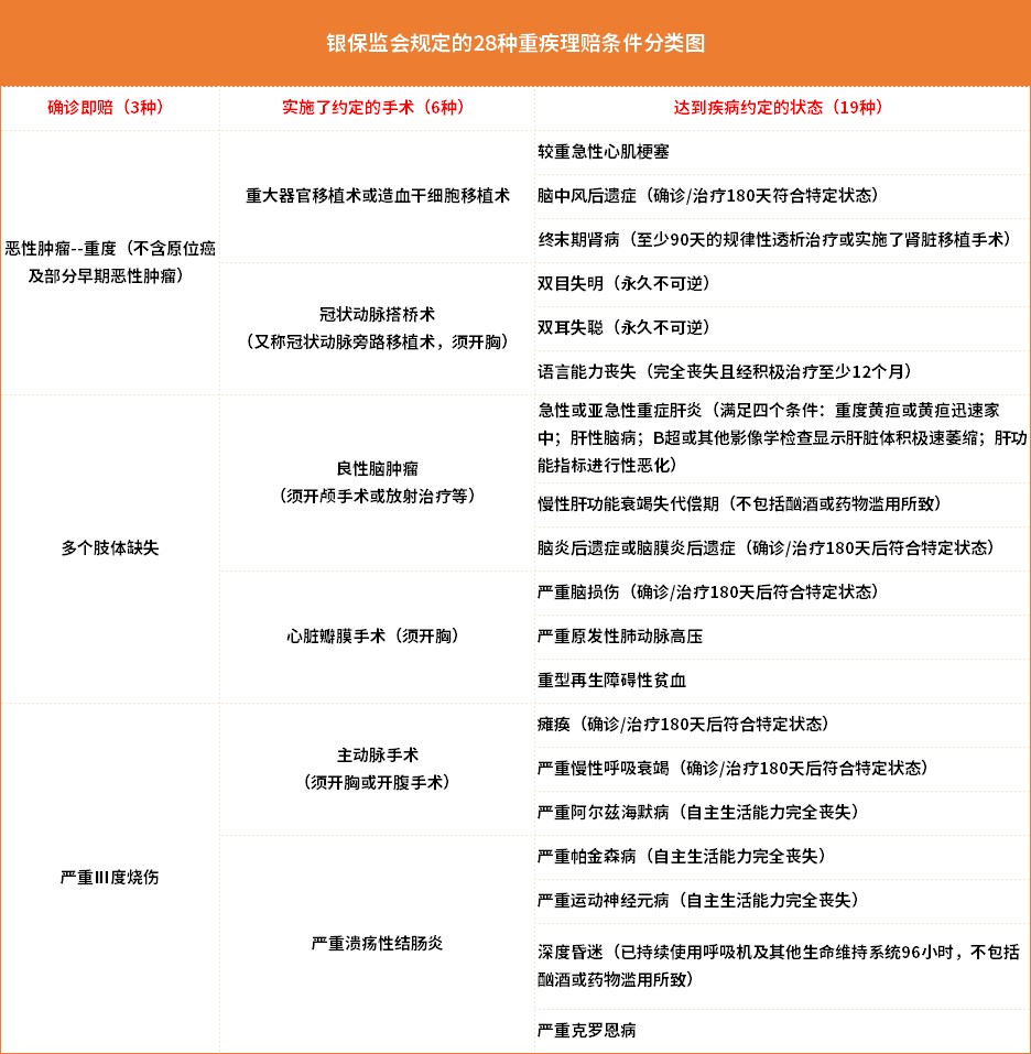 小新整理了「银保监会规定的28种重疾理赔条件分类图」,供大家参考: