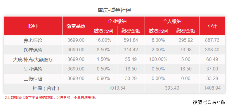 总结:如果按照最低社保基数3699来缴纳的话,重庆市最新的社保费用是1406.94元,其中公司需要缴纳的部分是1013.54元,个人需要缴纳的部分是393.4元。