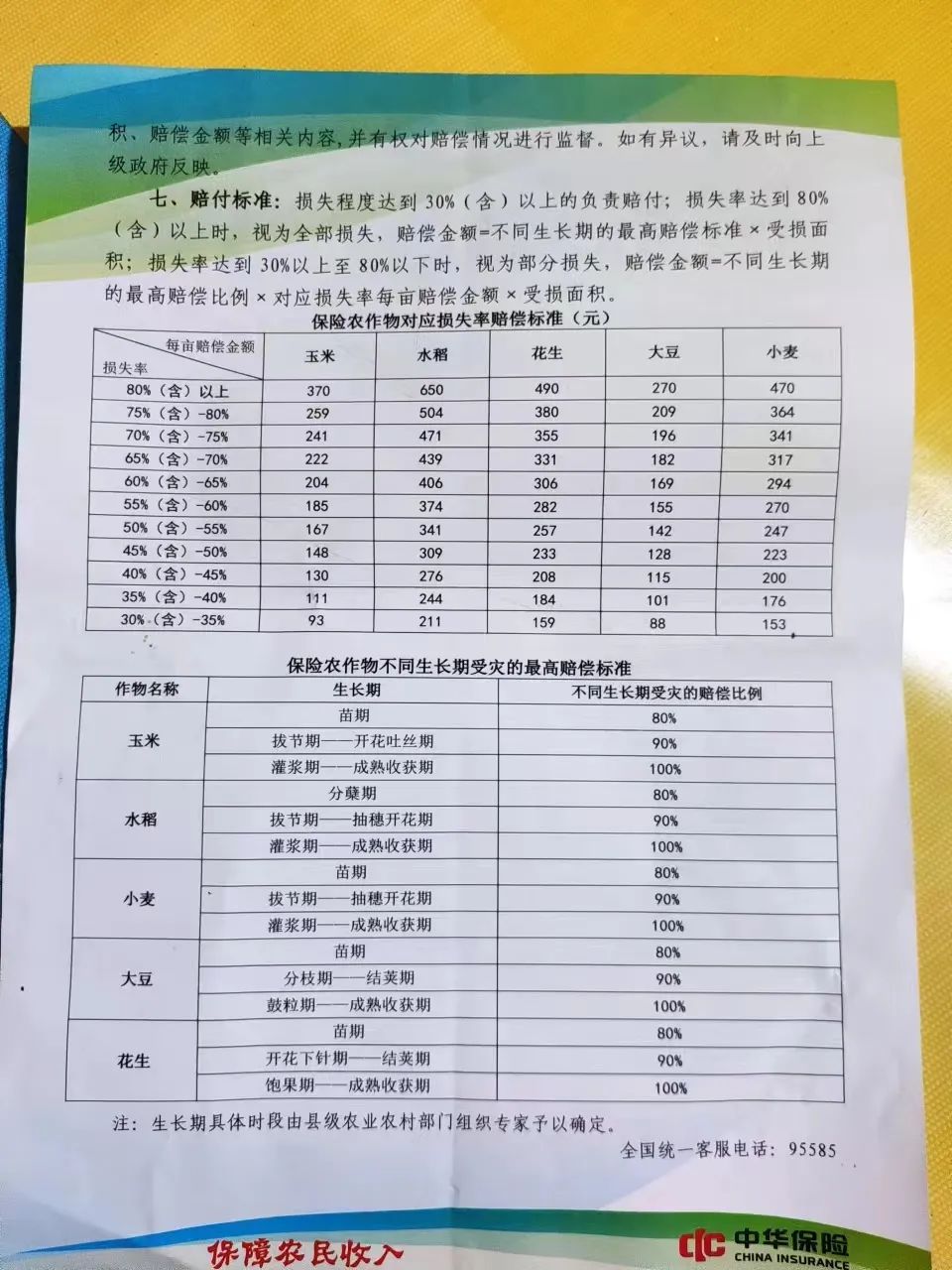 损失率达到80%以上时,视为全部损失,赔偿金额=最高保额×不同生长期的最高赔偿比例×受损面积。