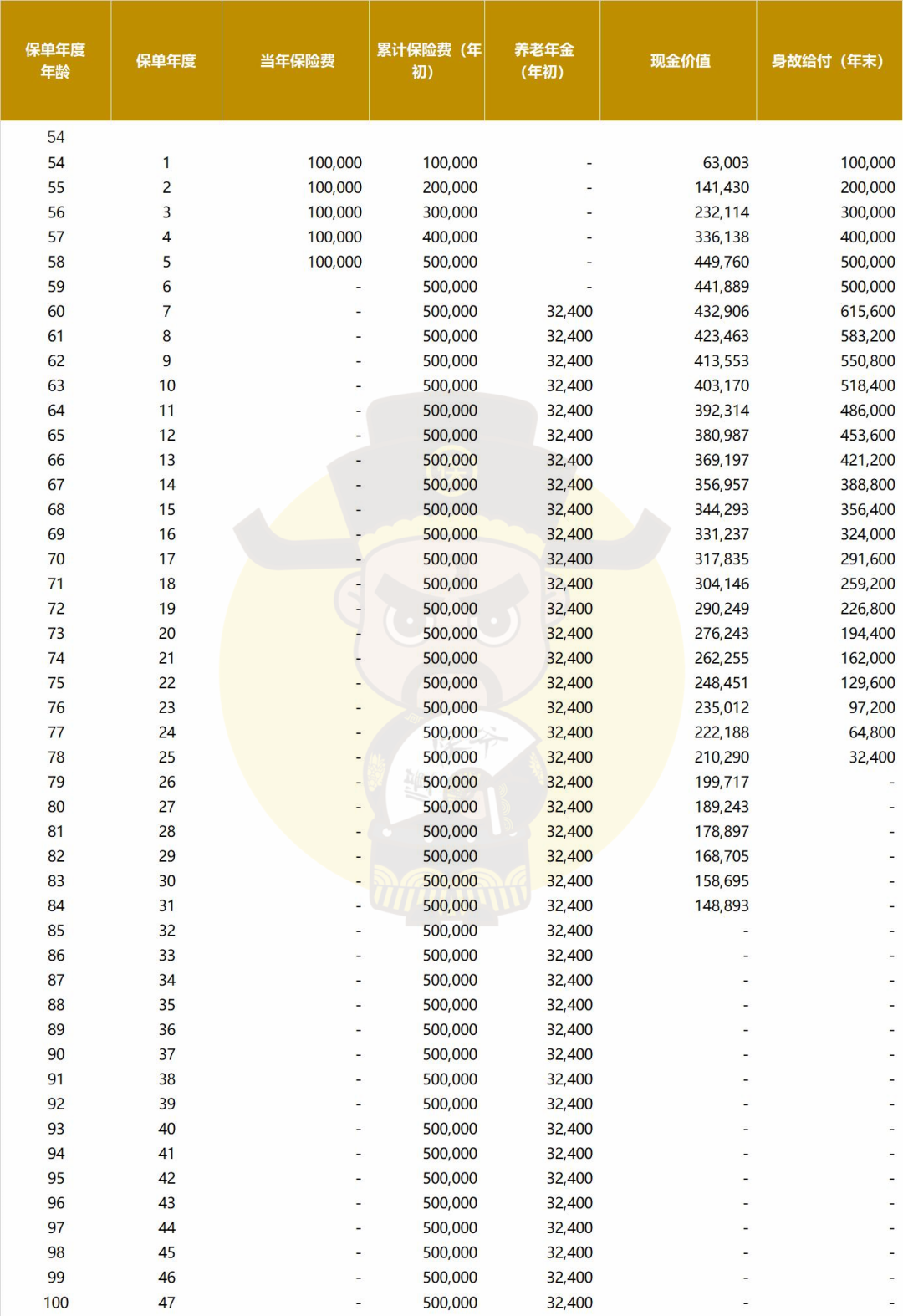 还可以保证领取20年,例如领了5年养老金后身故,保险公司会把剩下15年的养老金32400*15=48.6万元给到家人;