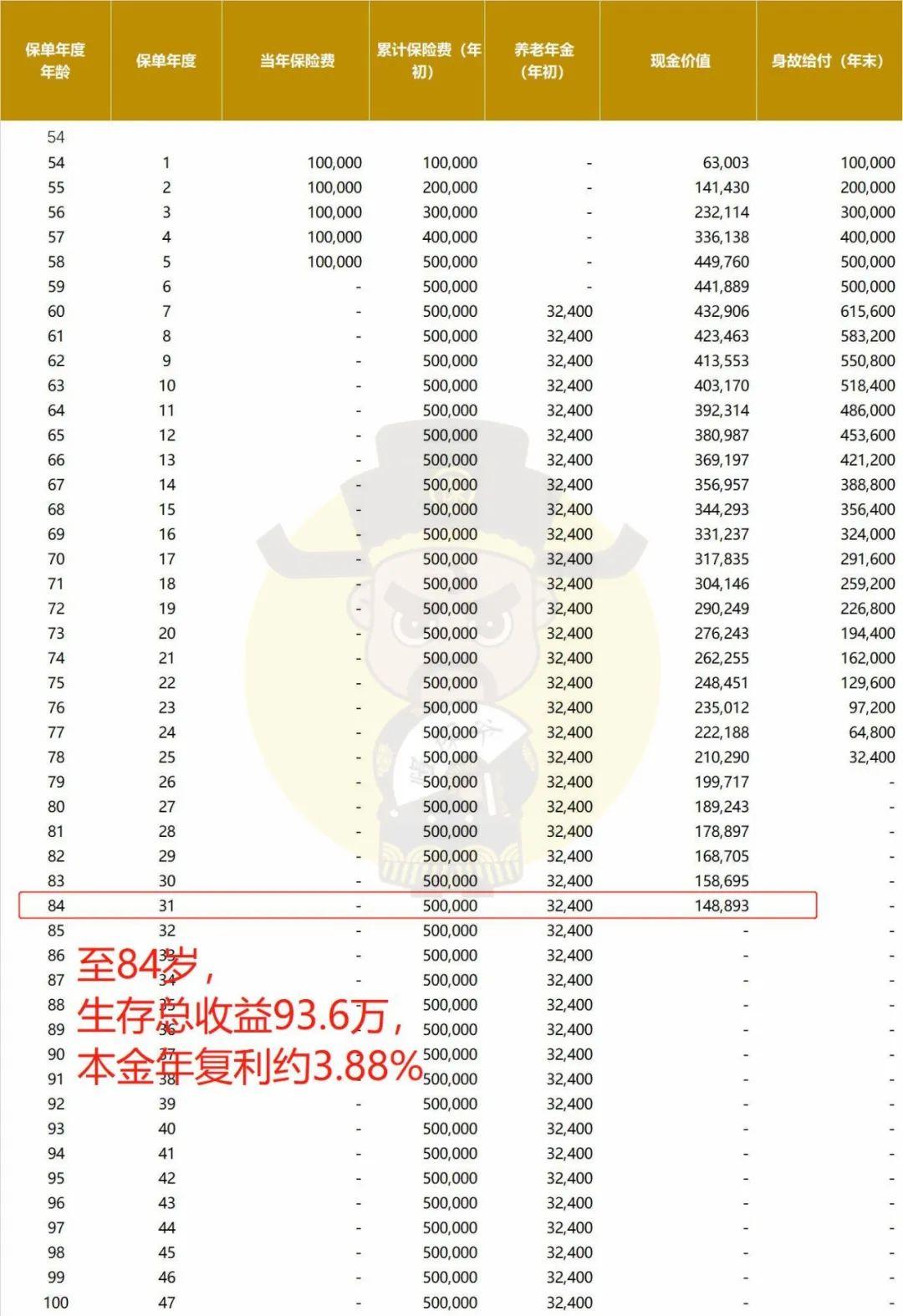 等到84岁,这也是有退保金的最后一年,生存总收益(含退保金)有93.6万,