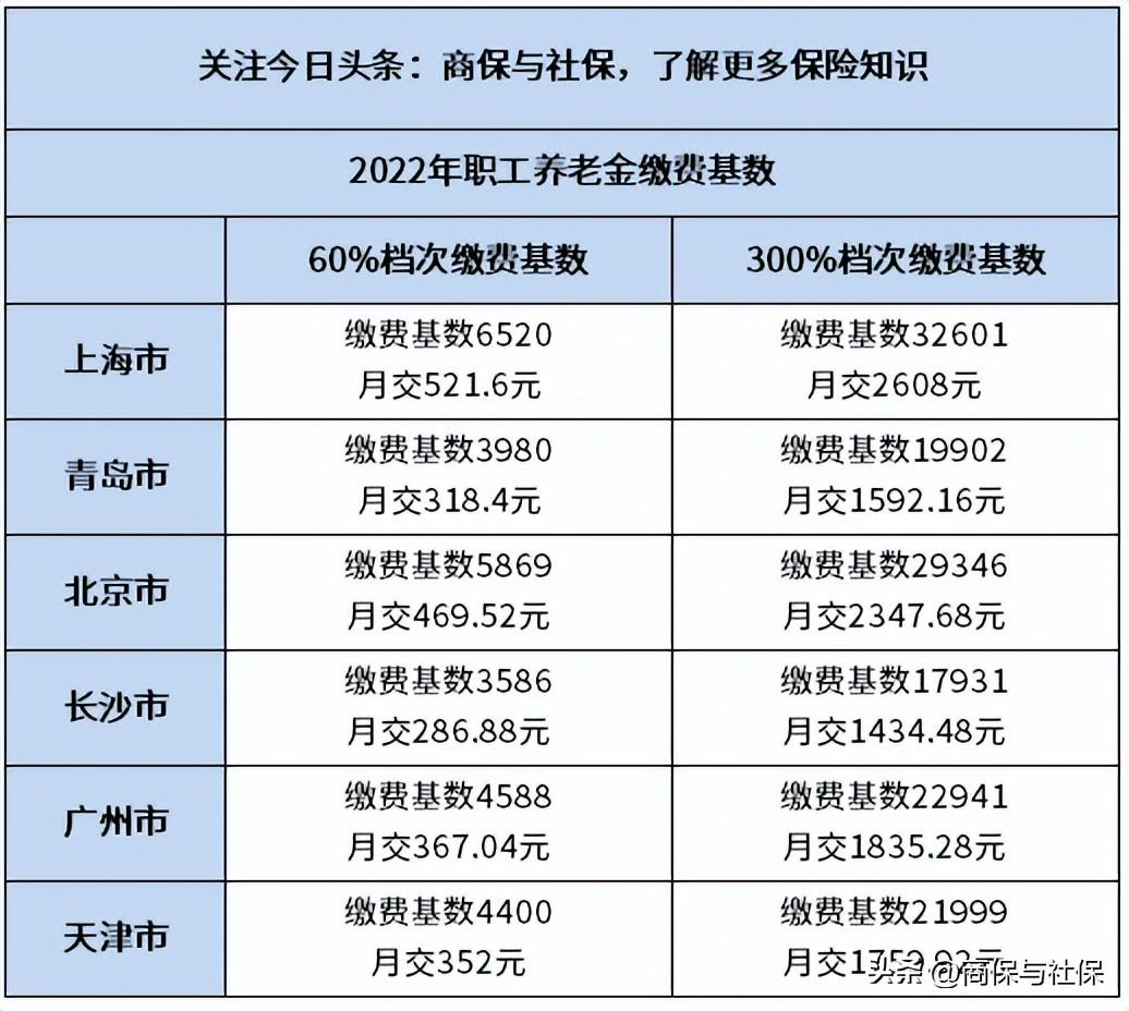 看看当前部分城市养老保险缴费基数上下限,包括北京、上海、广州、长沙、青岛、天津,可以反映沿海地区和内地养老保险缴费基数水平。