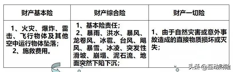 基本险:火灾、爆炸、雷击、飞行物坠落+施救、减损费用综合险:财产基本险+13种自然灾害+三停损失一切险:财产综合+责任免除以外所有的自然灾害和意外事故