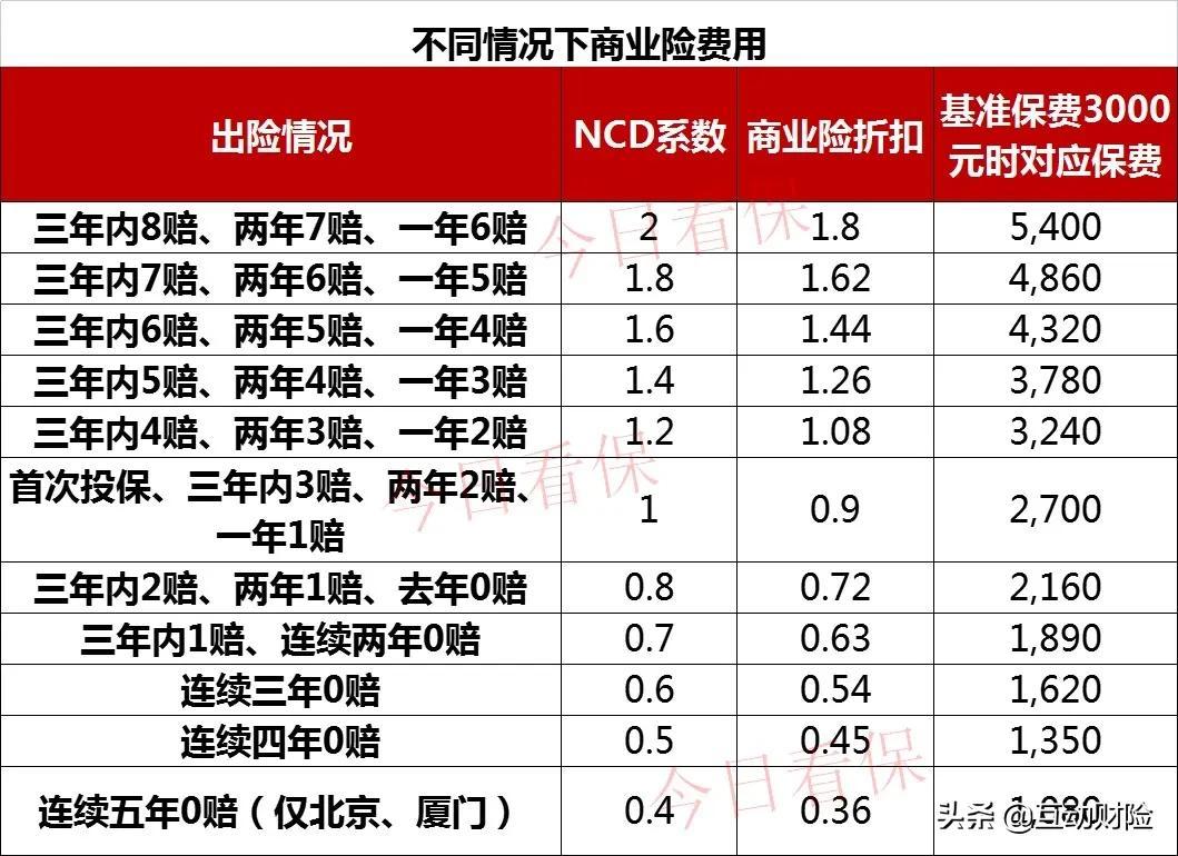 由此可以看出,交强险的理赔对保费的影响十分有限。当对方的损失超过2000元或自己的车呀,也需要修理那就得走商业险了。与交强险相比啊,商业险动辄大几千的保费。出险的次数对保费的影响比较大,所以出了事故就得好好的算算了。商业险的计算公式啊,等于基准保费乘以费率调整系数,其中基准保费由车辆的价格、零整比系数等多种因素决定。一般十多万的家用车的基准保费在3000元左右,费率调整系数等于NCD系数乘以自主定价系数乘以交通违法系数,其中NCD系数又称无赔款优待系数,根据近几年出险的情况,从0.4到2浮动。自主定价系数是指保险公司在一定范围内自主设置的商业险的折扣系数,自主定价系数从0.65到1.35浮动,我们统一采用0.9,部分省市会将商业险与该车辆或车主的交通违法记录挂钩,我们统一采用系数1。
