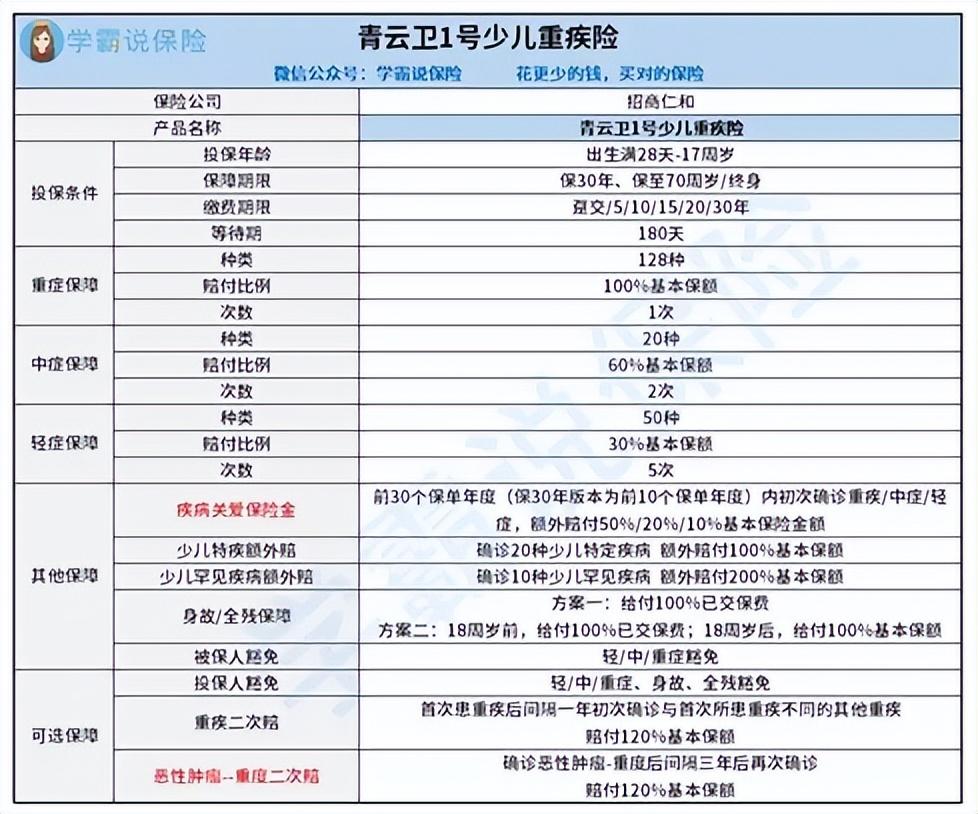 一、招商仁和青云卫1号少儿重疾险保障内容分析