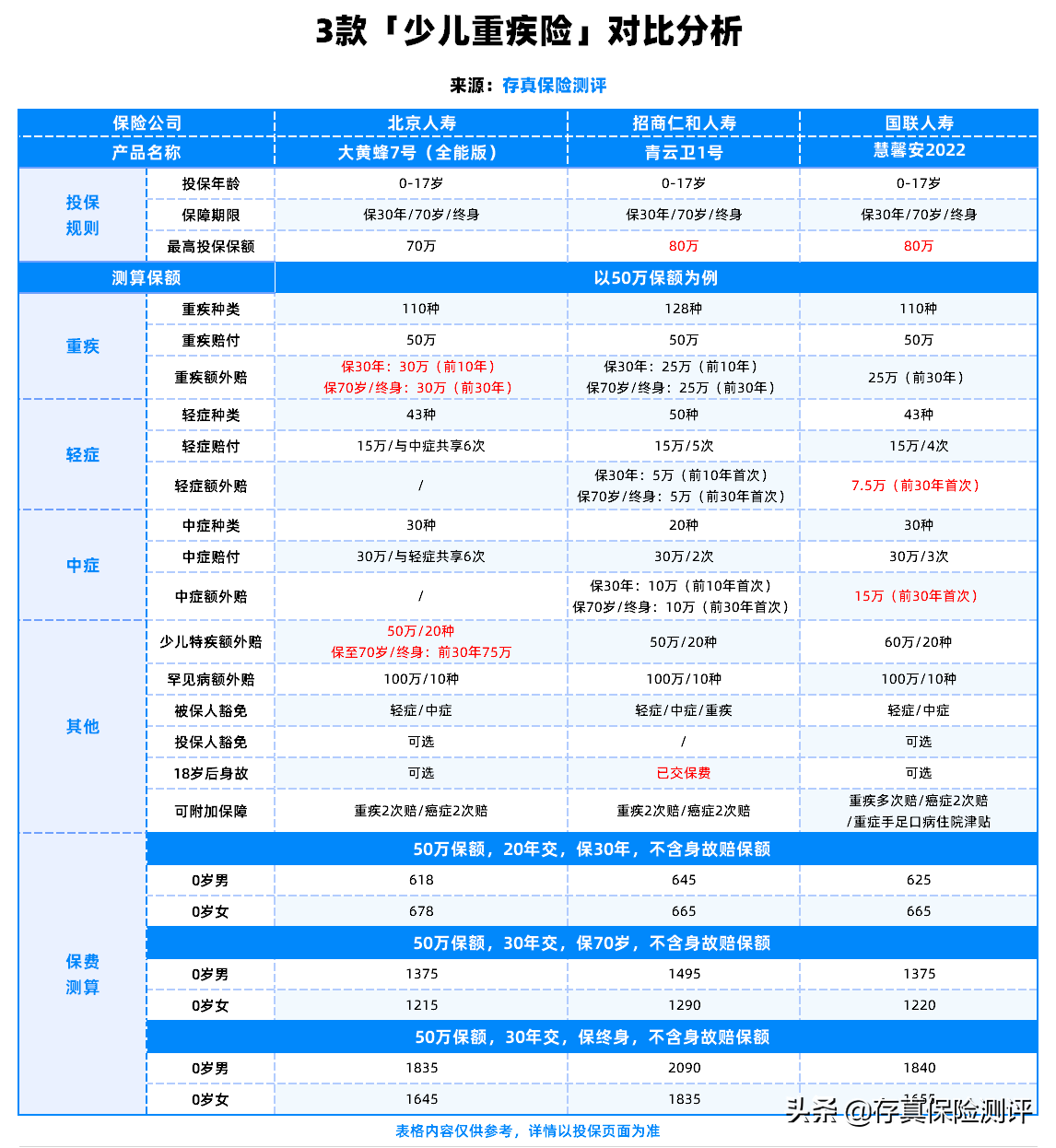 少儿重疾险往往是父母给孩子配置的第一份保险,经过市面上几十款产品一一对比,我们选取了三款比较热门又实用的产品进行分析,具体保障如下表: