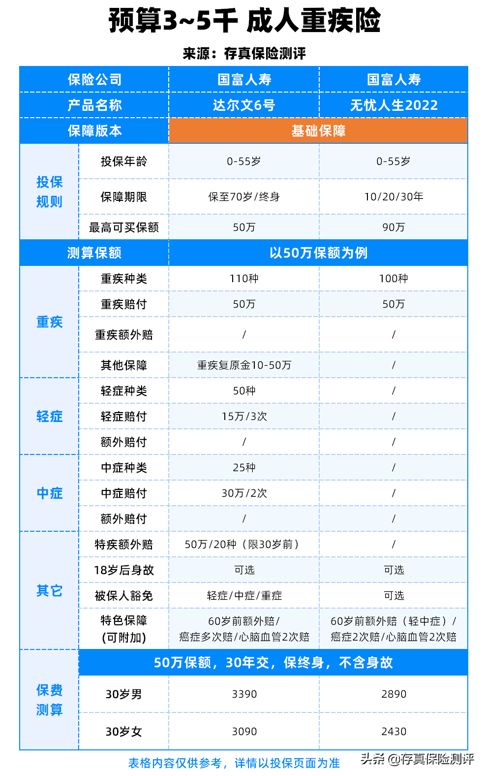 - 如果想要高保额:选 无忧人生 2022,最高能买 90 万保额,价格也便宜,30 岁人群购买一年只要两千多,很划算。