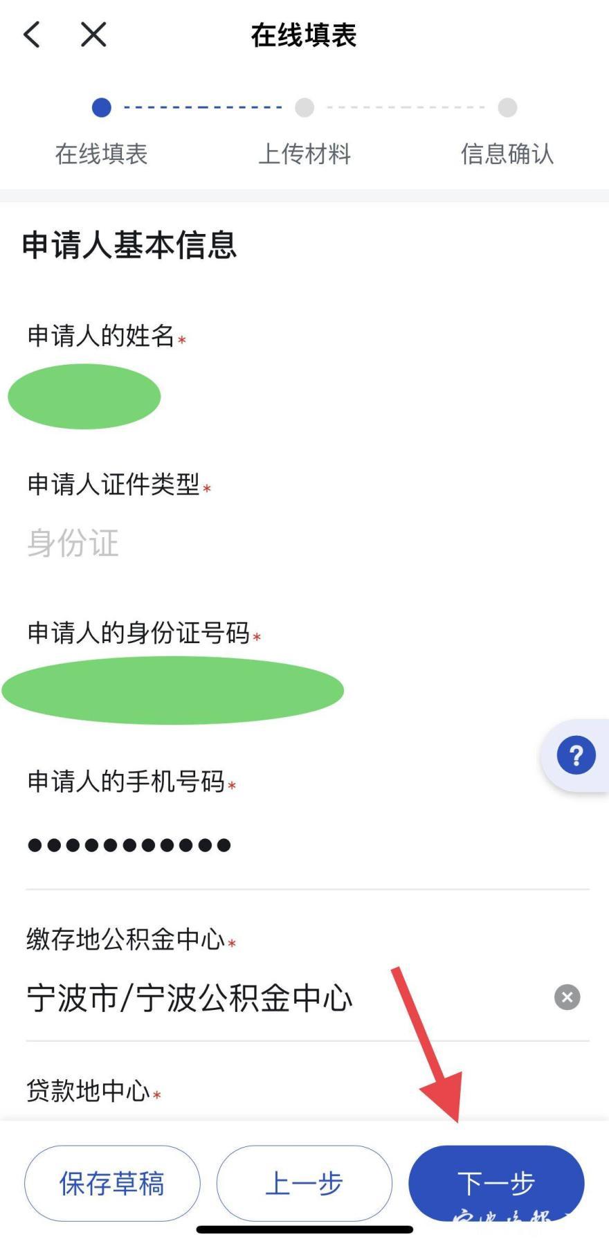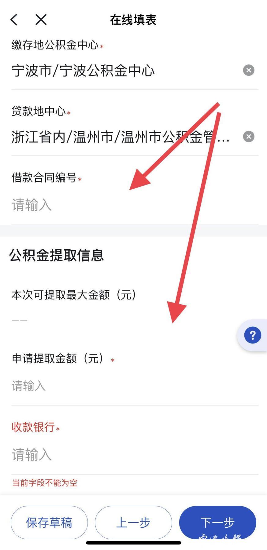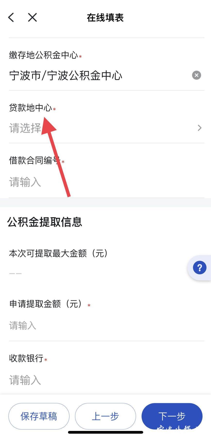 第五步,进行“在线填表”,完成后点击“下一步”。其中,“贷款地中心”,选择“浙江省内”,选择贷款地所在的城市,从下拉框选择借款合同编号,按要求输入申请提取金额、收款银行等信息后,进入“下一步”操作,直至完成办理。