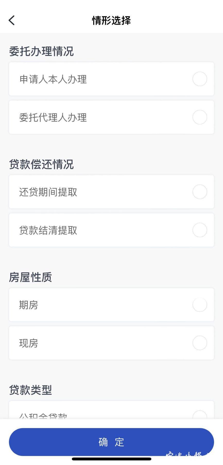 第四步,填写“情形选择”里的内容,贷款类型选择“公积金贷款”。我们以“还贷期间提取”为例,进行下一步操作,操作完成后,点击下方“确定”。