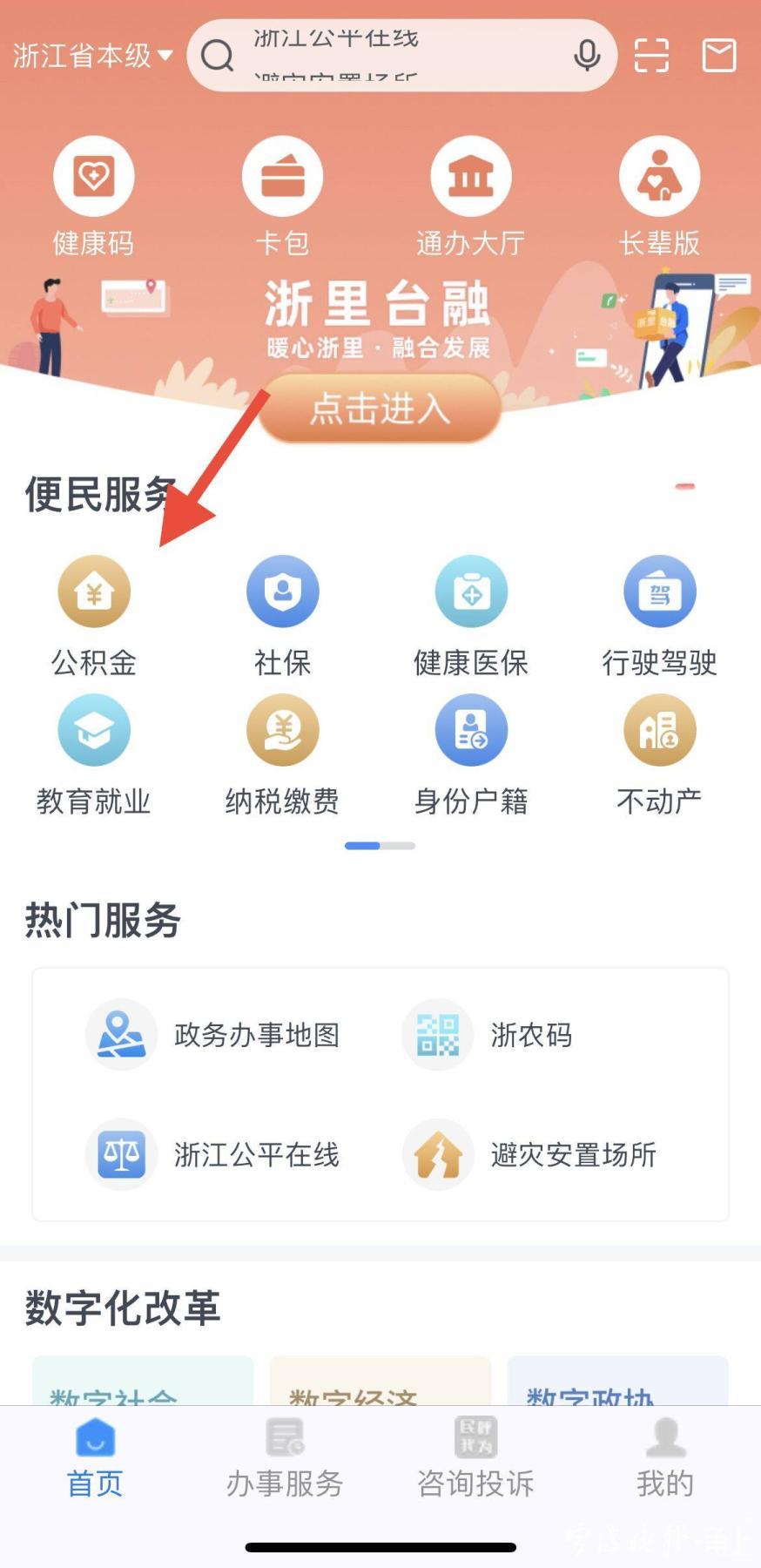 第一步,打开浙里办APP,点击“公积金”。