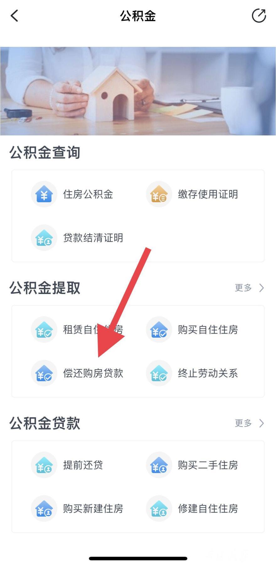 第二步,在“公积金提取”栏,点“偿还购房贷款”。