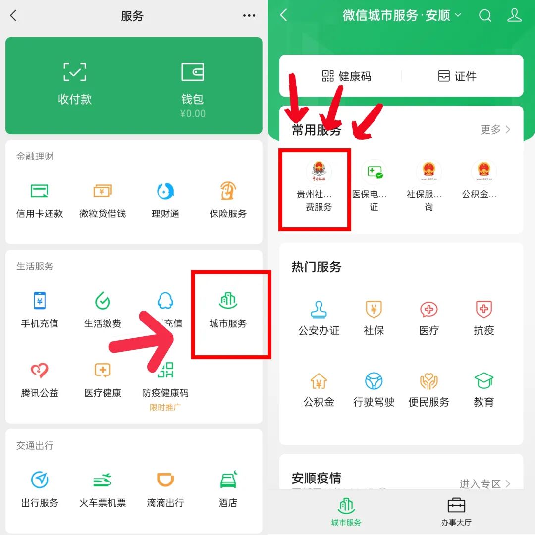 打开微信→点击“我”→点击“支付”→点击“城市服务”(选择缴纳医保费的城市.安顺)