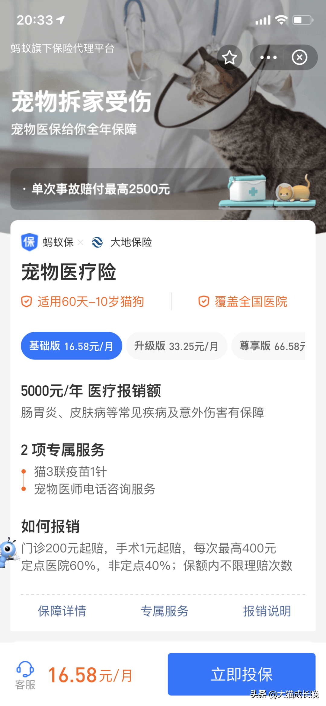 所以宠物,从来没有“重疾险”“意外险”“寿险”,唯一能有的是类似人类的“医疗险”。