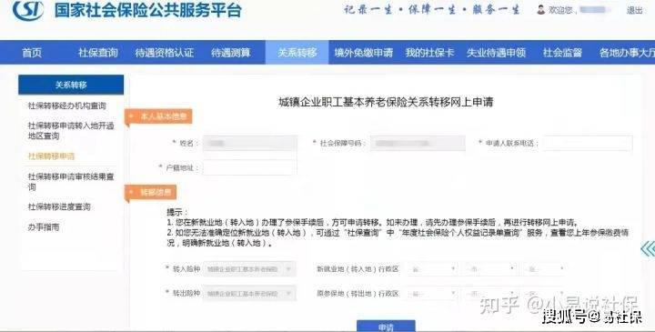 第四步:上述信息都输入完成,核对无误,点击“申请”按钮,转移接续的申请就完成了。由转入地经办机构负责受理申请,进行后台审核,