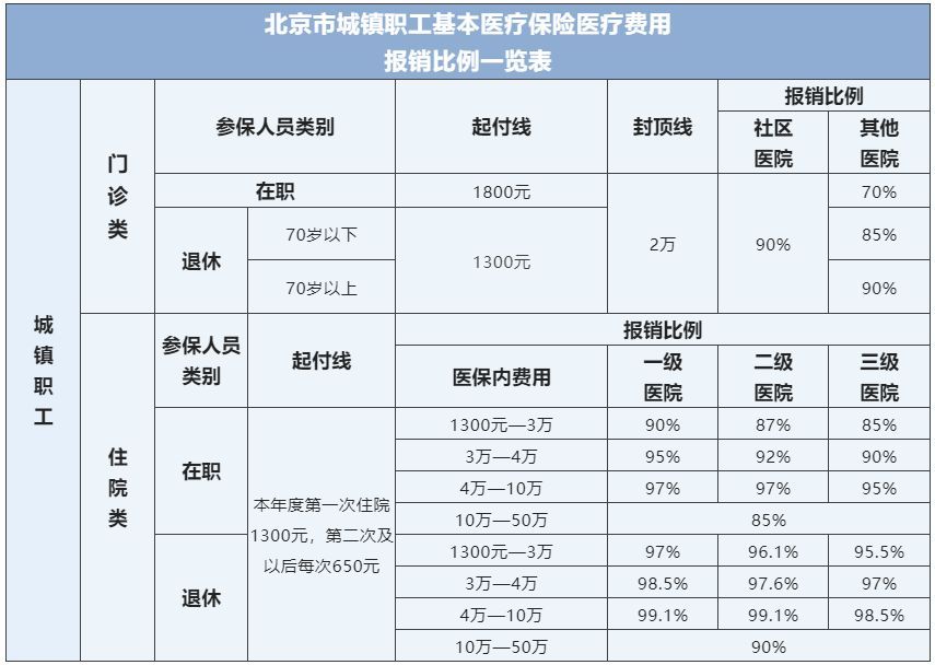 北京市在职职工住院报销比例在85%以上,退休人员住院报销比例在90%以上,最高可达99.1%,住院封顶线为50万元。