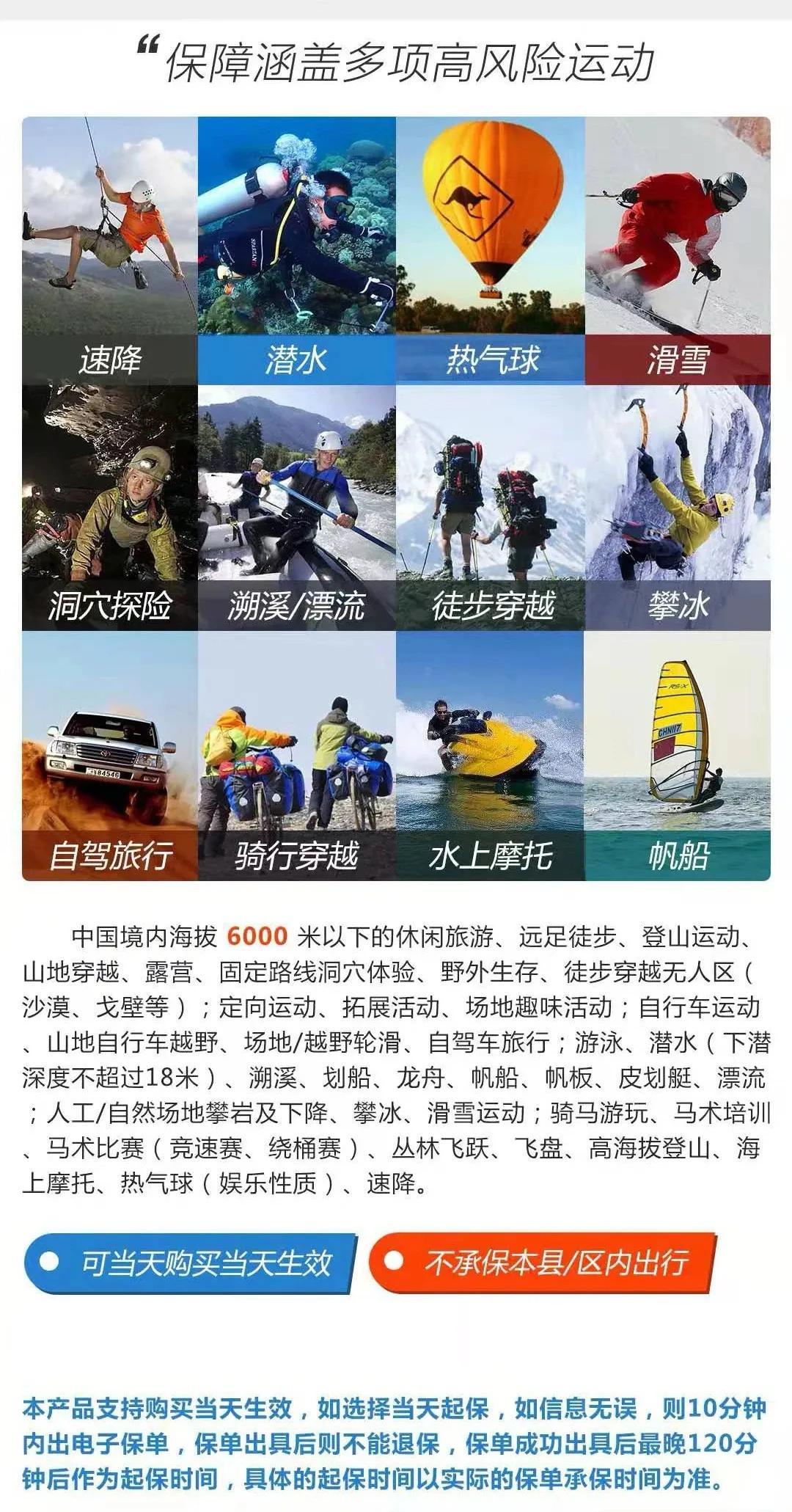 户外救援险在保险条款中明确承保户外运动项目,不仅涵括了各种户外运动及活动(包括但不限于徒步、登山、骑行、自驾、拓展、露营、骑马、滑雪、海钓、攀岩、攀冰、划船等);还扩展承保在户外运动同时所进行的其他运动(包括游泳、冲浪、轮滑、定向越野、帆船、漂流、溯溪、帆船、热气球、洞穴探险等各类俱乐部可能组织的户外运动项目)。