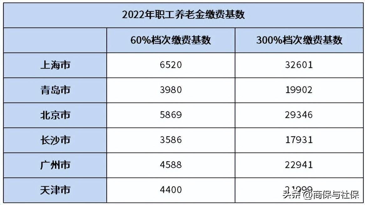 看看2022年不同城市职工养老保险缴费基数上下限:
