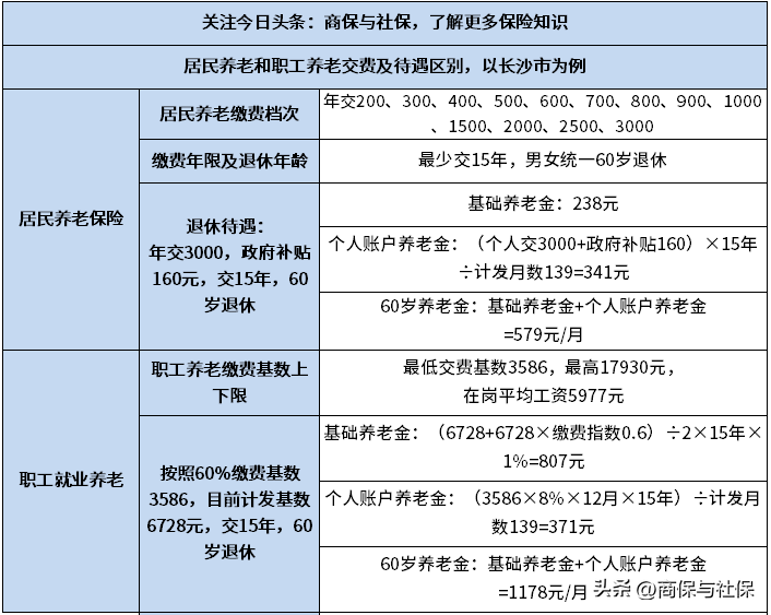 看看居民养老按照年交3000元,交15年;职工养老按照最低60%档次交15年,看看退休待遇计算,具体如下图: