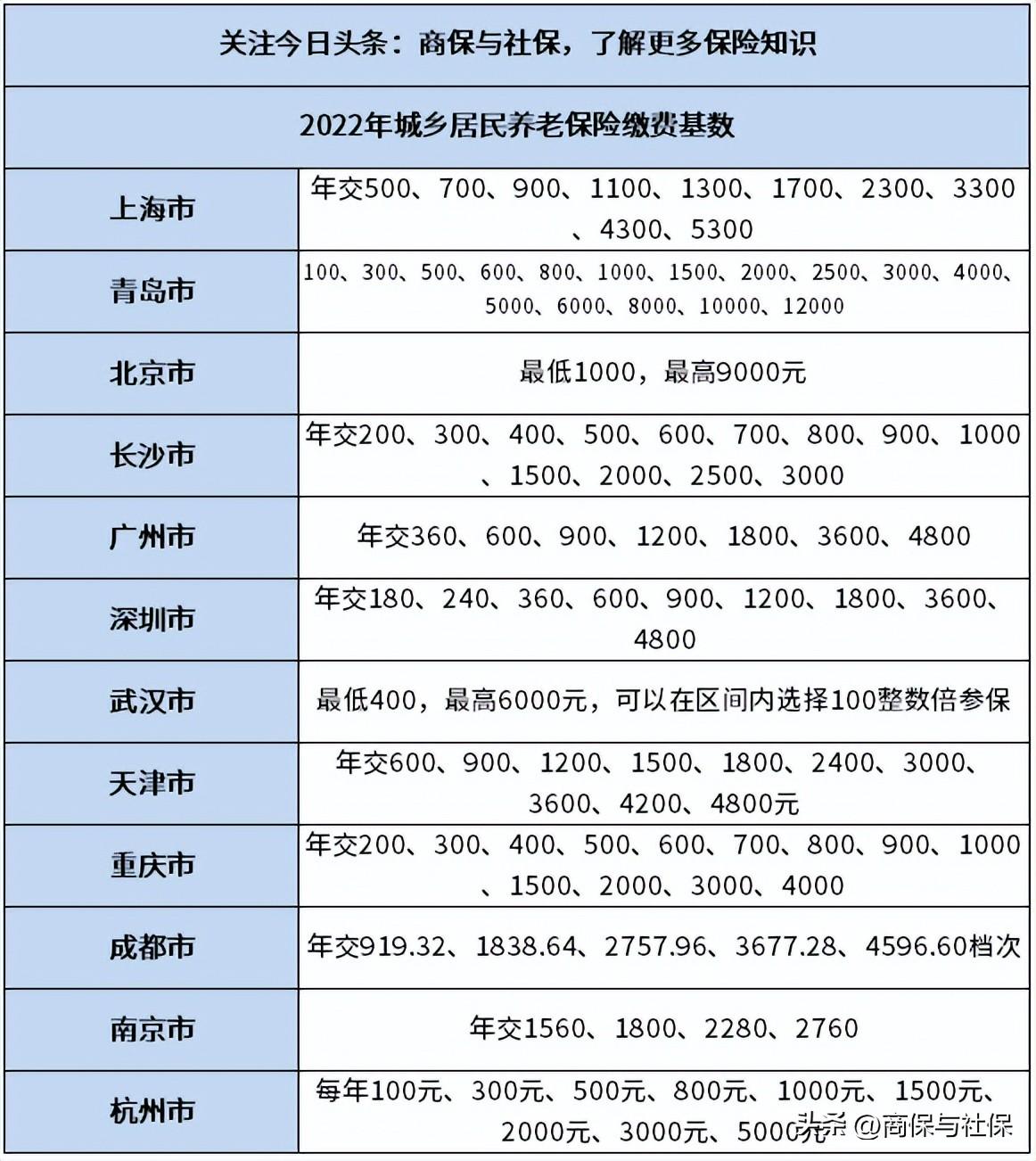 居民养老缴费基数,有的地方针对低保户、特困供养人员、残疾人等设置年交100元档次,甚至不用交费,保费由政府负担,而普通居民最低缴费基数各地有明显区别,比如上海500元/年起交、北京1000元/年起交、武汉是400元/年起交、天津是600元/年起交。