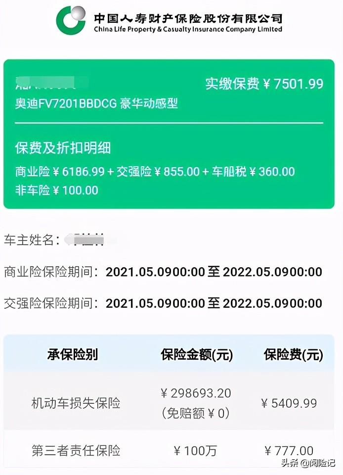 去年买的新车,今年是第二年,属于C级车,比较豪华的类型,开车一年来没有出过险,看看这种昂贵车型的车险保费:由中国人寿财险承保,总共保费7502元。