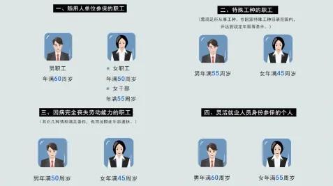 1、用工单位参保职工。男满60岁,女干部(管理、专技岗位)满55岁,女工人满50岁。
